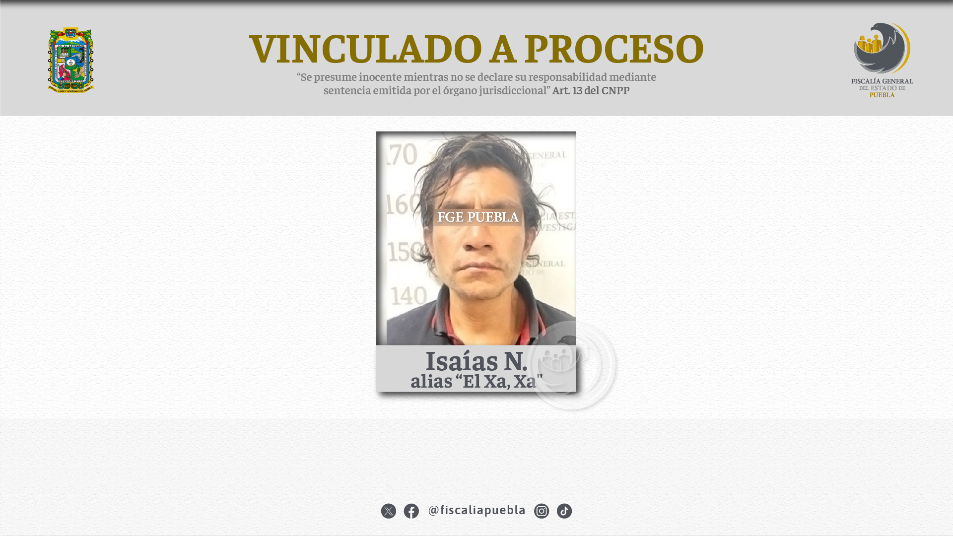 La Fiscalía General del Estado de Puebla cumplió orden de aprehensión contra Isaías N. alias “El Xa,xa”, investigado por los delitos de lesiones calificadas y ataques peligrosos.