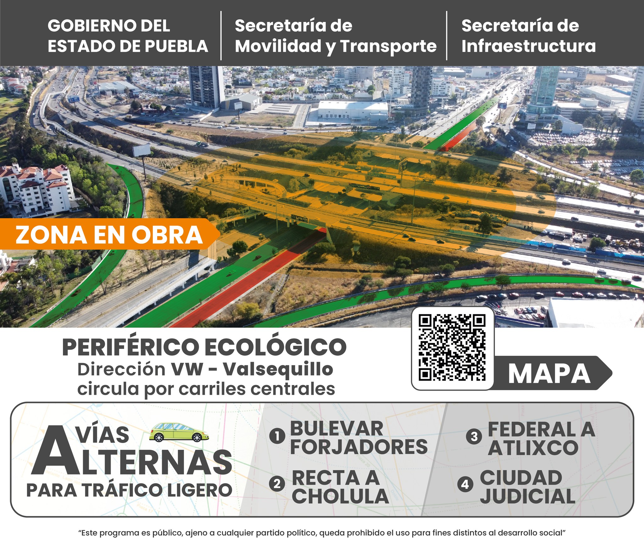 Por obras en Periférico Ecológico-Vía Atlixcáyotl te sugerimos utilizar carriles centrales o tomar las siguientes vías alternas para evitar el tráfico en la zona.