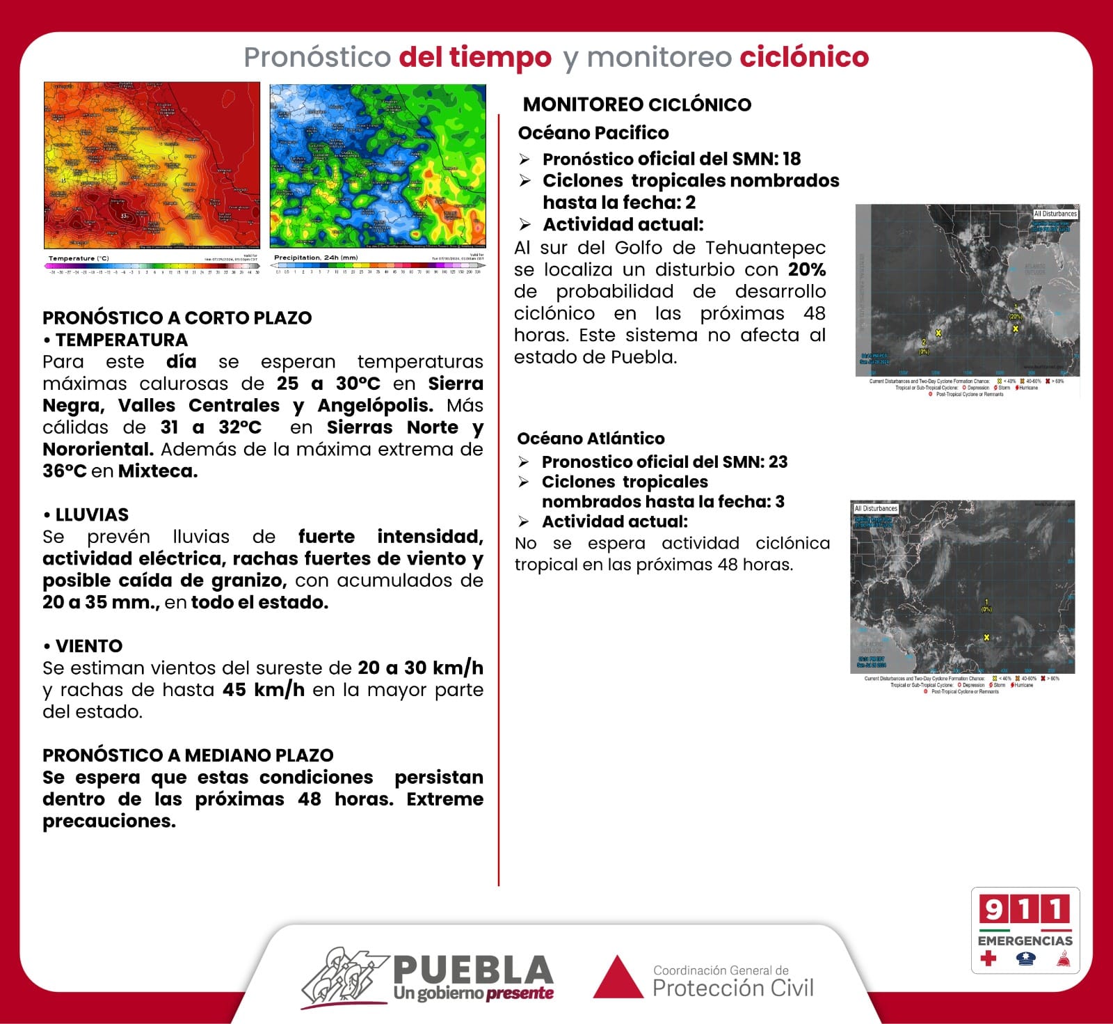 ⛈️ En el día se prevén lluvias de fuerte intensidad, actividad eléctrica, rachas fuertes de viento y posible caída de granizo en todo el estado.