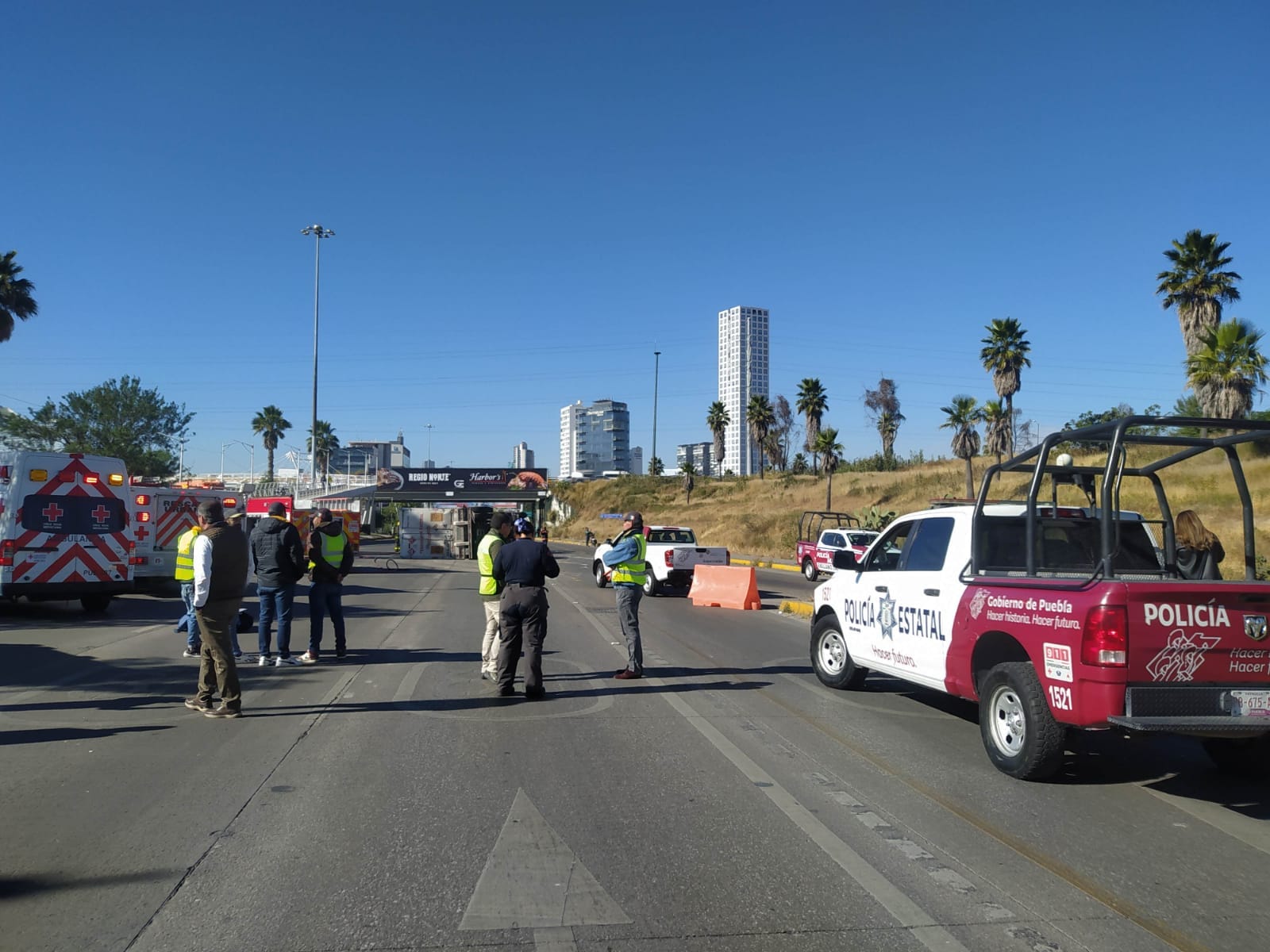 Ante la volcadura de un camión en la Vía Atlixcáyotl, Policías Estatales Bomberos y elementos del área de Seguridad y Proximidad de Caminos de Caminos coordinan labores con cuerpos de emergencia estatales y municipales.
