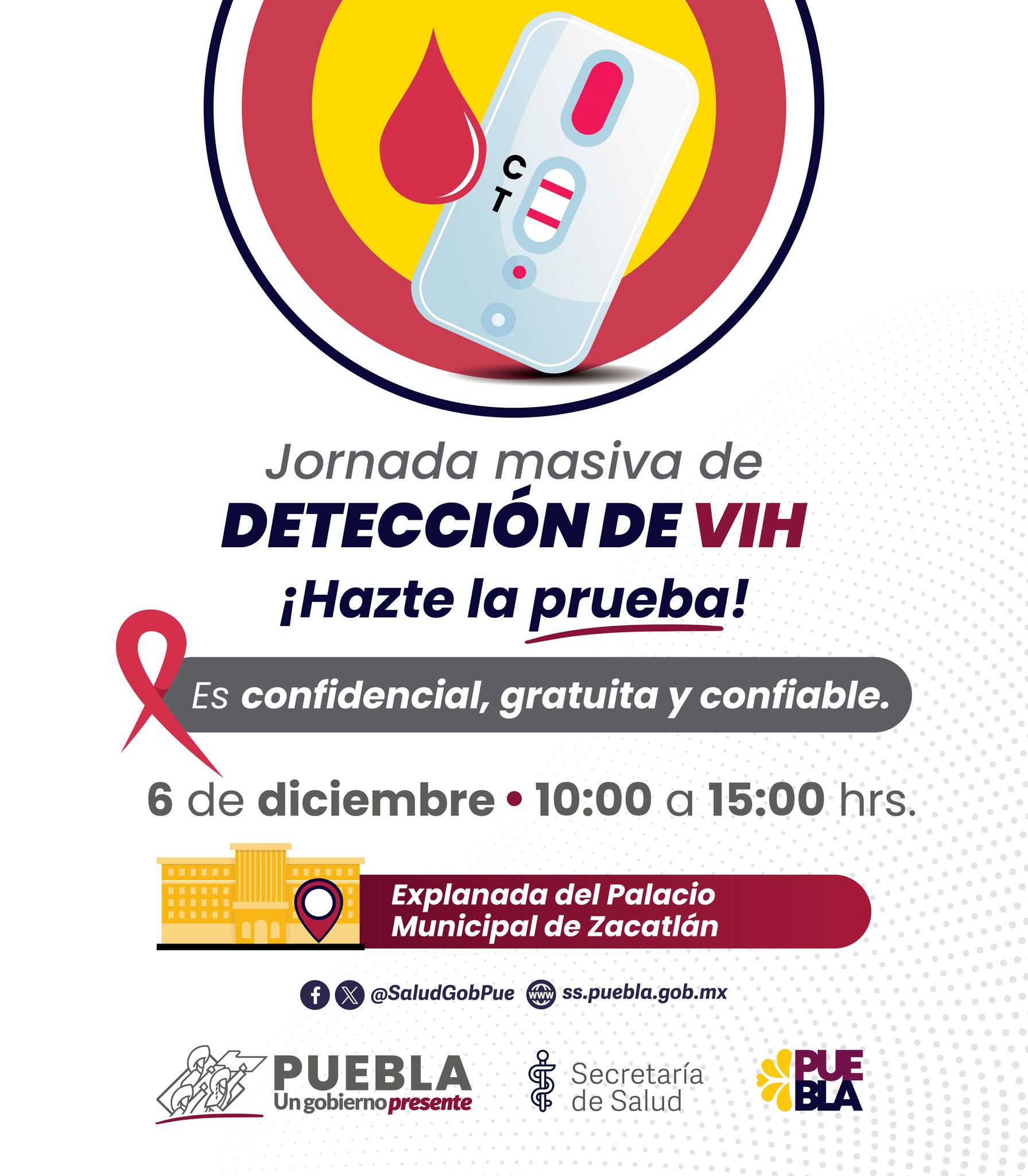 Este 🗓️ 6 de diciembre hazte la prueba de #VIH 🩸 en la Explanada del Palacio Municipal de Zacatlán.