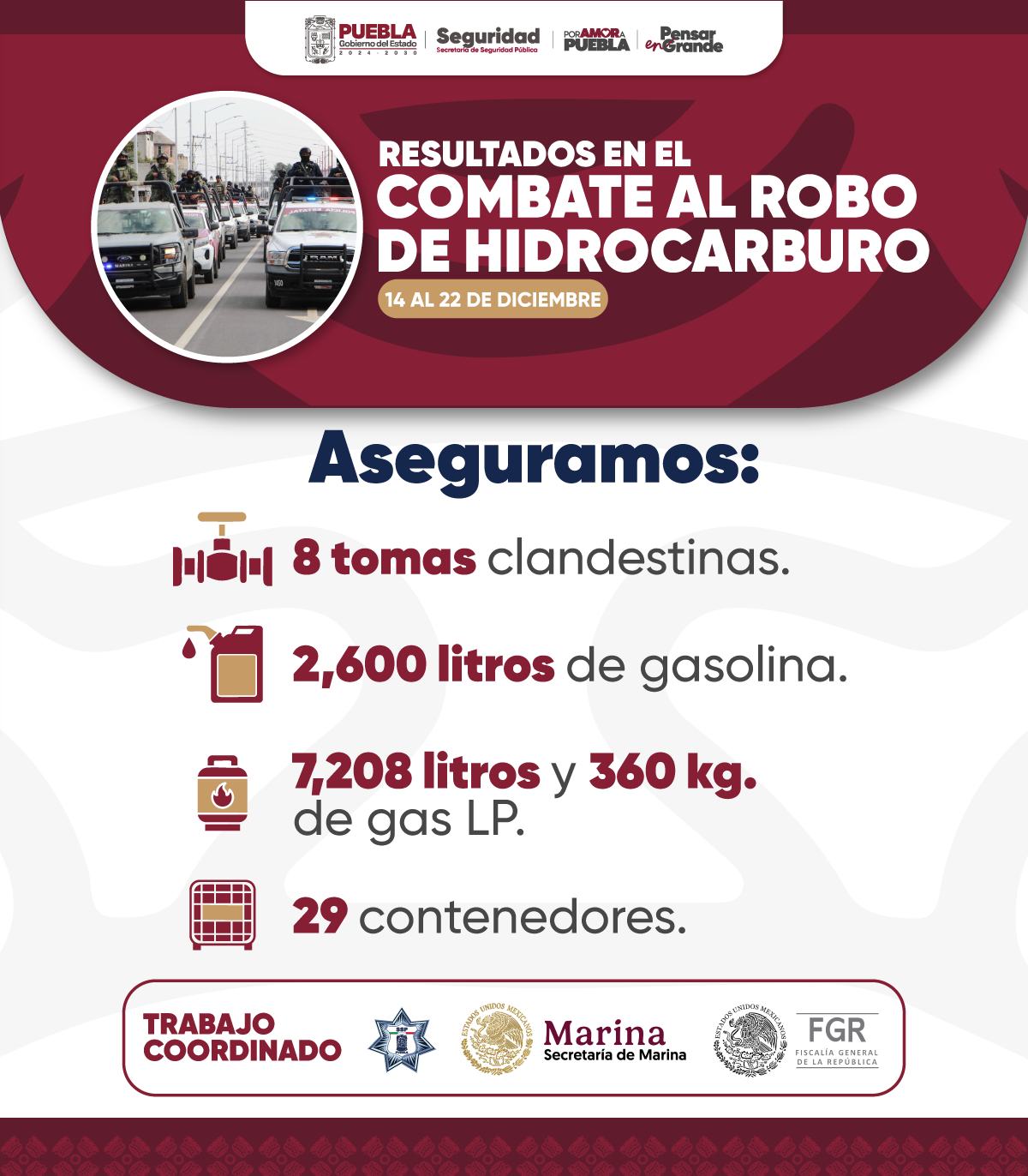 Conoce los resultados del trabajo coordinado entre la Policía Estatal, Secretaría de Marina y Fiscalía General de la República para hacer frente al robo de hidrocarburo en la entidad. En tan solo una semana fueron asegurados más de 7 mil litros y 360 kg de gas LP.