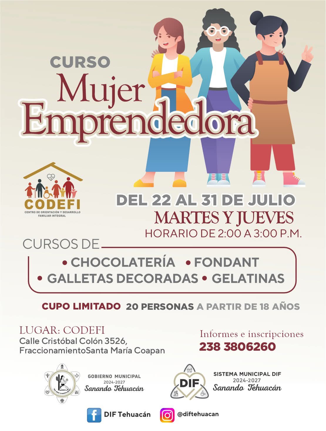 El Gobierno de Tehuacán, encabezado por el Dr. Alejandro Barroso Chávez, y la Dra. Letty Carreño Abarca, presidenta del Sistema Municipal DIF, a través de CODEFI, te invitan a ser parte del Curso “Mujer Emprendedora”, diseñado para fortalecer tus habilidades y abrir nuevas oportunidades de ingreso.